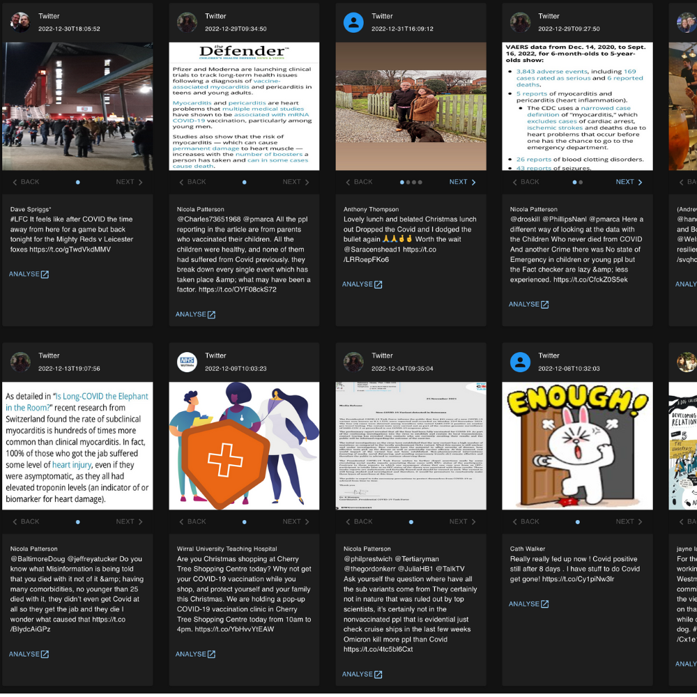 The project team can identify illicit or even hateful content as well as multimodal and latent SVO (subject–verb–object) analysis for simultaneously finding meanings from images and text. The results are interpreted in relation to the timeline of key events during the pandemic, for example, lockdown, availability of vaccinations, hospitalisation rates etc., assisting with the identification of misinformation.